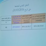 كما تم خلال اللقاء، استعراض التدفقات المالية للجامعة للربع السنوي الثاني من هذا العام من يناير حتى يونيو 2016م والإشارة إلى مستوى التقدم في اعتماد الجامعة على التمويل الذاتي. إلى جانب مقارنة نسبة تغطية دفعيات الطلاب للميزانية التشغيلية للربع الثاني من عام 2016م حيث غطت الرسوم ما نسبته 97 % من المصروفات التشغيلية والرأسمالية والتطويرية .