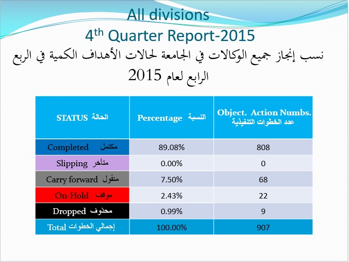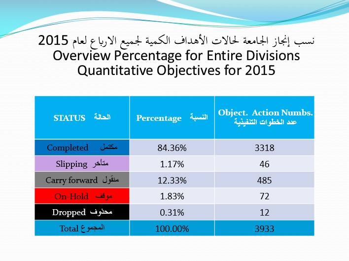The University managed to achieved 89.08% for the fourth quarter of 2015. While the percentage of late objectives is 0%, suspended 2.43%, carried forward is 7.50% and remaining 0.99% objectives were dropped. In order to increase the working spirit and appreciate the effort of the staff, MEDIU rewarded the best staff who achieved their targets and accomplished their tasks as well as raising the level of quality and efficiency.
