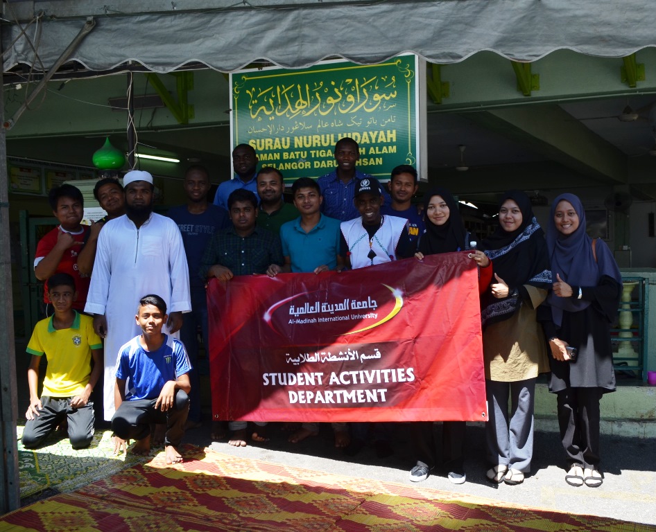 Universiti Antarabangsa Al-Madinah (MEDIU) yang diketuai oleh Bahagian Hal Ehwal Pelajar berpeluang di dalam sesi gotong royong bersama ahli jawatankuasa surau untuk aktiviti pembersihan Surau Nurul Hidayah, Baru Tiga, Shah Alam pada hari Jumaat, 9 Mac 2018. Para pelajar dari Fakulti Komputer dan Teknologi Maklumat, Fakulti Kejuruteraan dan Fakulti Bahasa telah mengambil bahagian di dalam aktiviti tersebut.