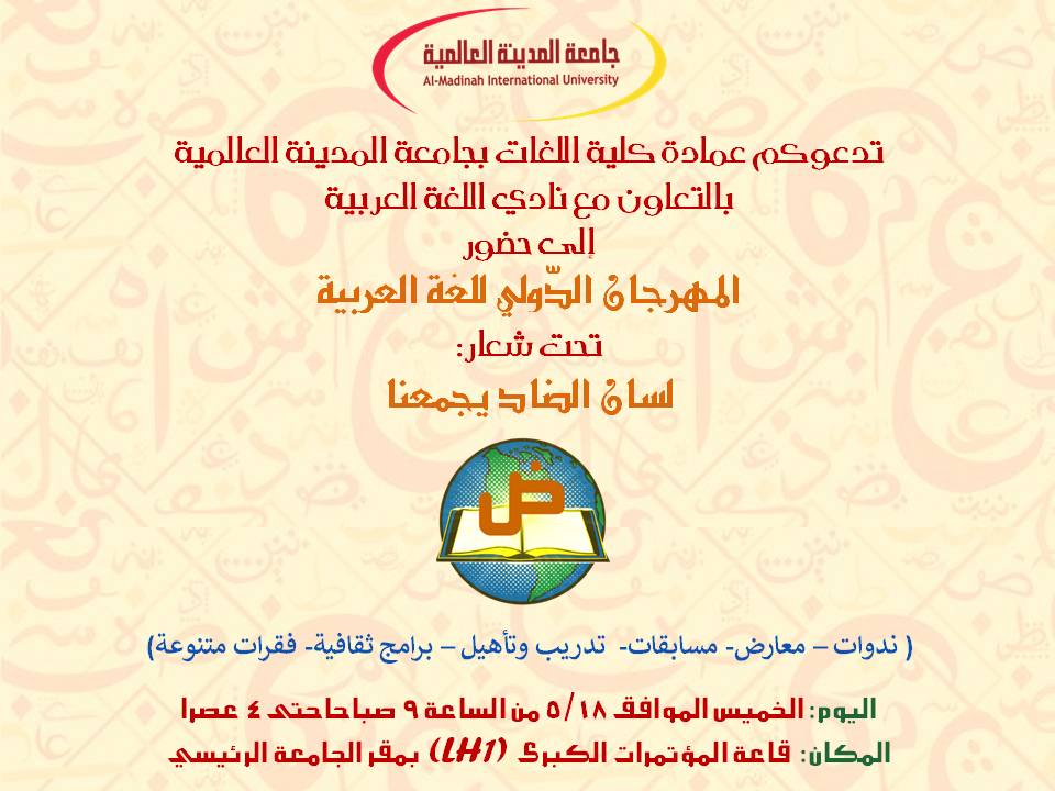 تعلن كلية اللغات وبالتعاون مع نادي اللغة العربية في جامعة المدينة العالمية عن إقامة المهرجان الدولي للغة العربية تحت شعار “لسان الضاد يجمعنا” وذلك في تمام الساعة التاسعة صباحاً وحتى الرابعة عصراً ليوم الخميس الموافق 18/05/2017م، في المقر الرئيس للجامعة في شاه علم بماليزيا.