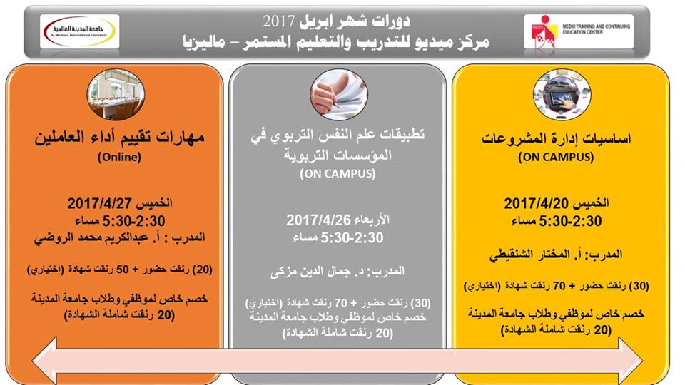 يُسر مركز ميديو للتدريب والتعليم المستمر أن يُعلن عن عقد الدورات التدريبية التالية لشهر إبريل 2017م: