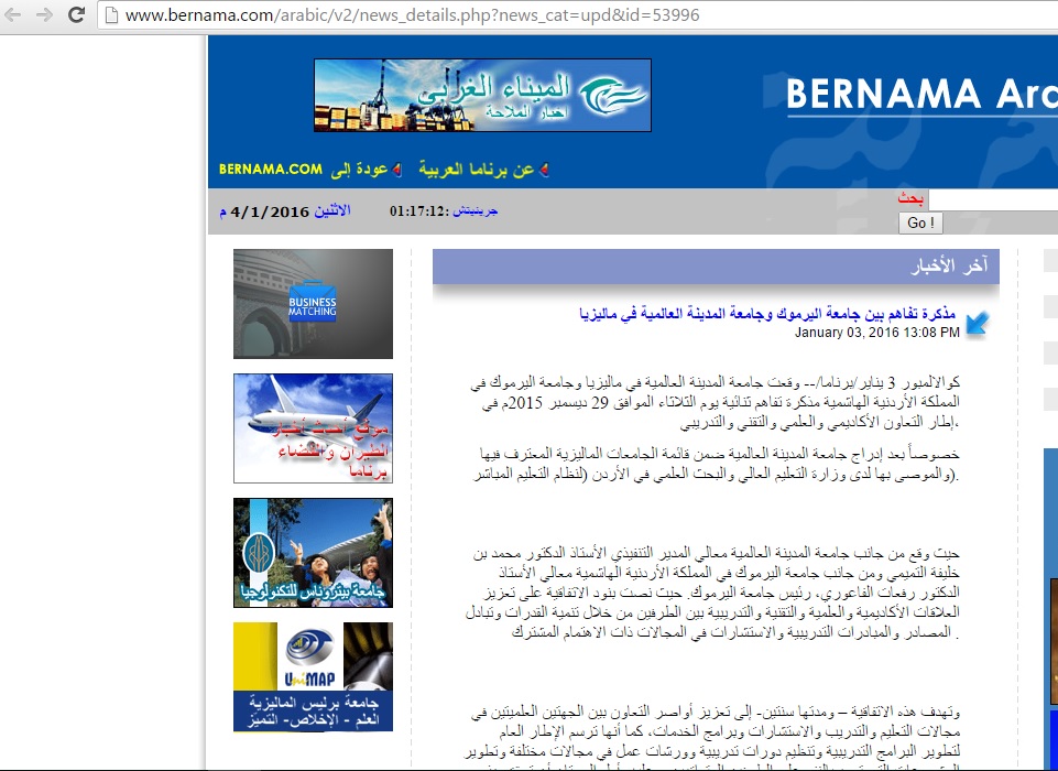 برناما تنشر خبر توقيع مذكرة تفاهم بين جامعة اليرموك وجامعة المدينة العالمية في ماليزيا