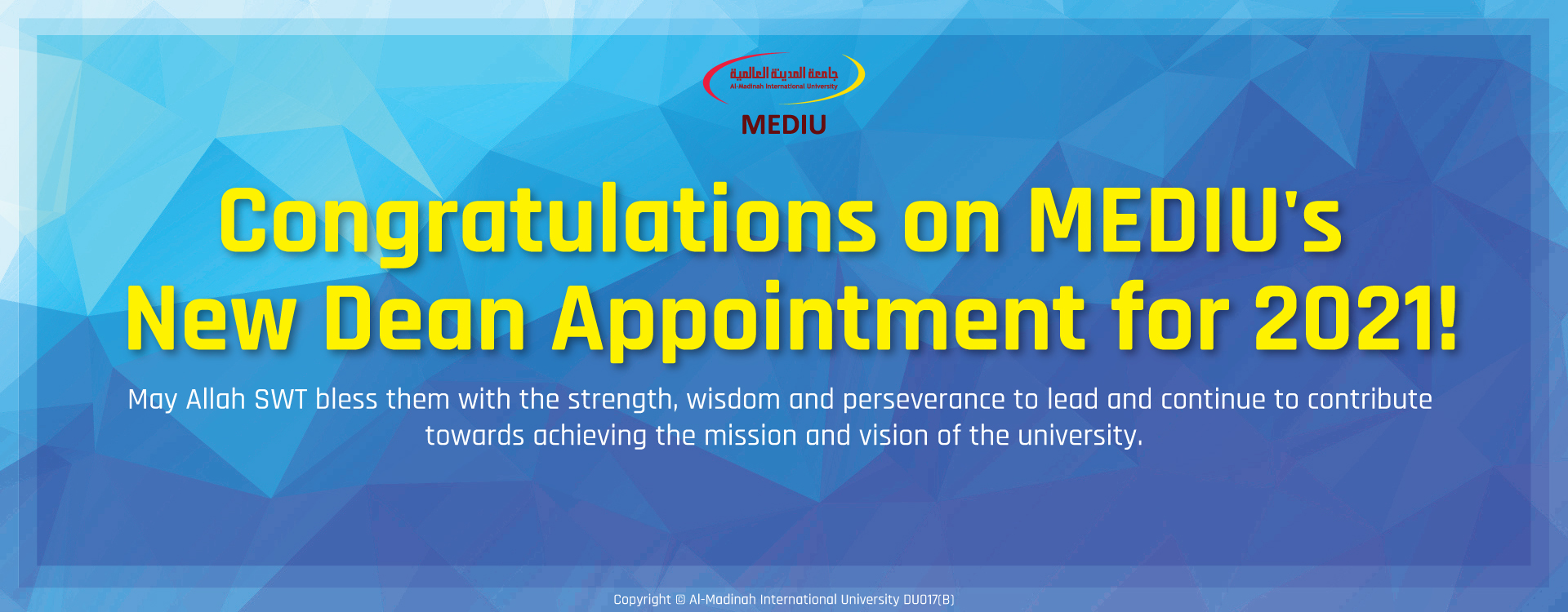 The Management of Al-Madinah International University (MEDIU) extend their heartfelt congratulations to the new deans appointment for the year 2021!