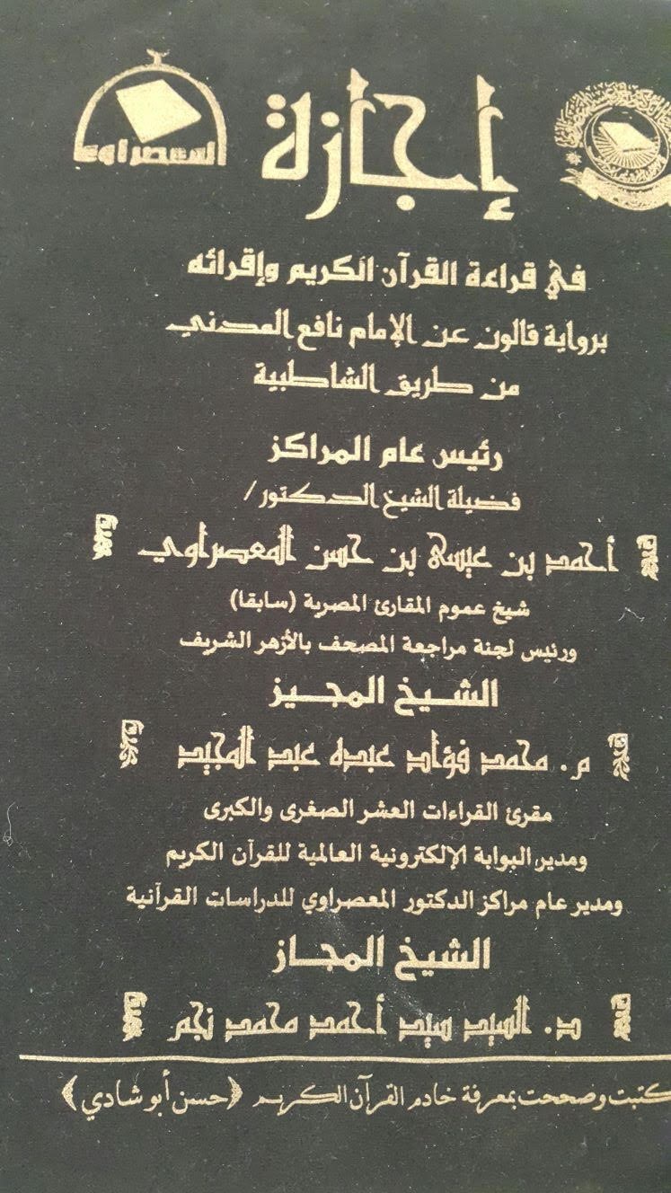 يُذكر أنه تم منح الزميل الأستاذ المشارك الدكتور سيد نجم، إجازة في قراءة عاصم الكوفي براوييه حفص وشعبة في شهر مايو 2015م.