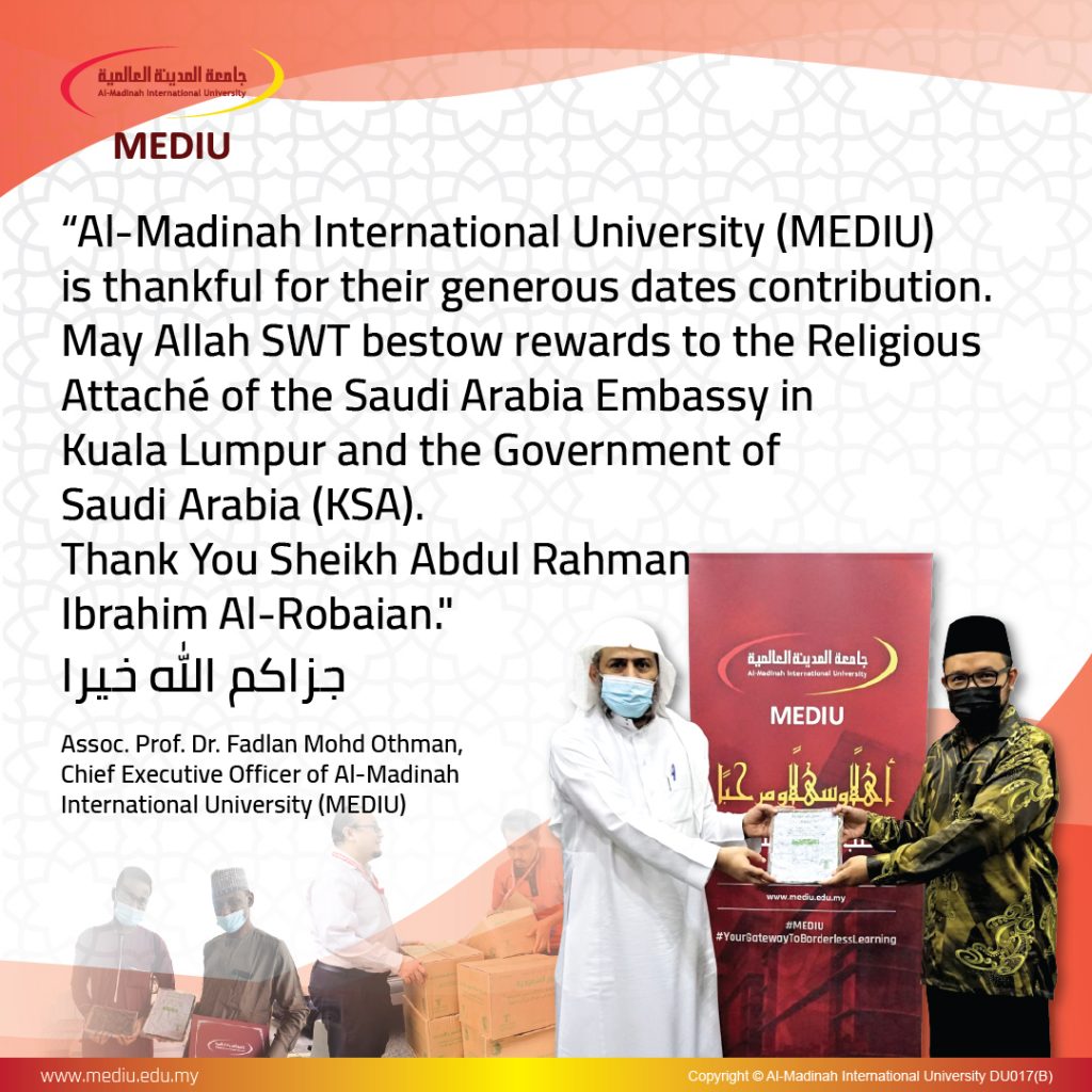Al-Madinah International University (MEDIU) is pleased to receive contribution of dates from the Kingdom of Saudi Arabia which was presented by the Religious Attaché of the Embassy of Saudi Arabia, Sheikh Abdul Rahman Ibrahim Al-Robaian on Thursday, 22 April 2021.