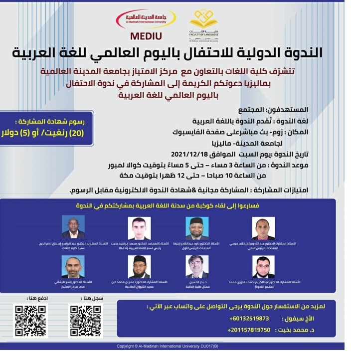 Al-Madinah International University (MEDIU) represented by the Deanship of Student Affairs recently organized on the activities for the International Festival of the Arabic Language virtually on Saturday, 18 December 2021 in conjunction of the celebration of the International Day of the Arabic Language.