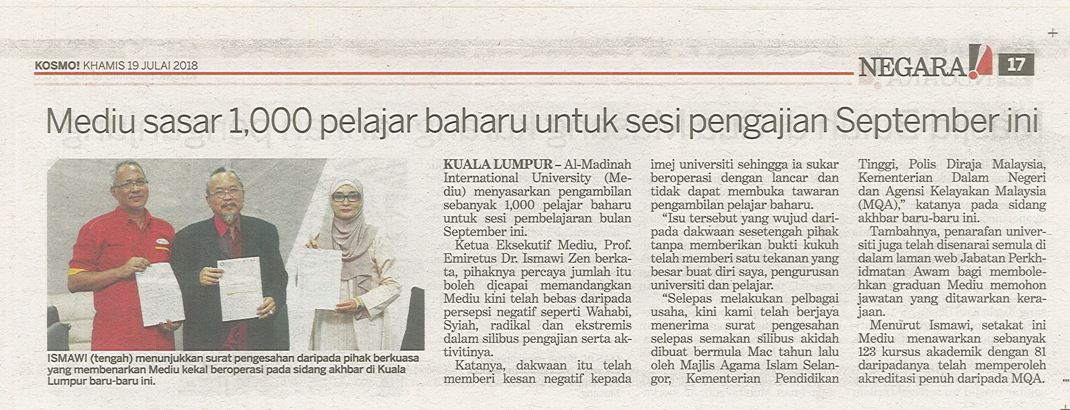 MEDIU sasar 1,000 pelajar baharu untuk sesi pengajian September ini – Kosmo (Negara), 19/7/2018 (Khamis)