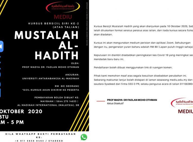 Universiti Antarabangsa Al-Madinah (MEDIU) baru-baru ini mengadakan kursus pendek ‘Mustalah Al-Hadith’ pada hari Sabtu, 10 Oktober 2020. Ini merupakan kursus kedua yang dikelolai oleh Ketua Eksekutif MEDIU, Prof. Madya Dr. Fadlan Mohd Othman melalui aplikasi maya ‘Zoom’ dan dilaksanakan sesuai untuk difahami oleh masyarakat umum.