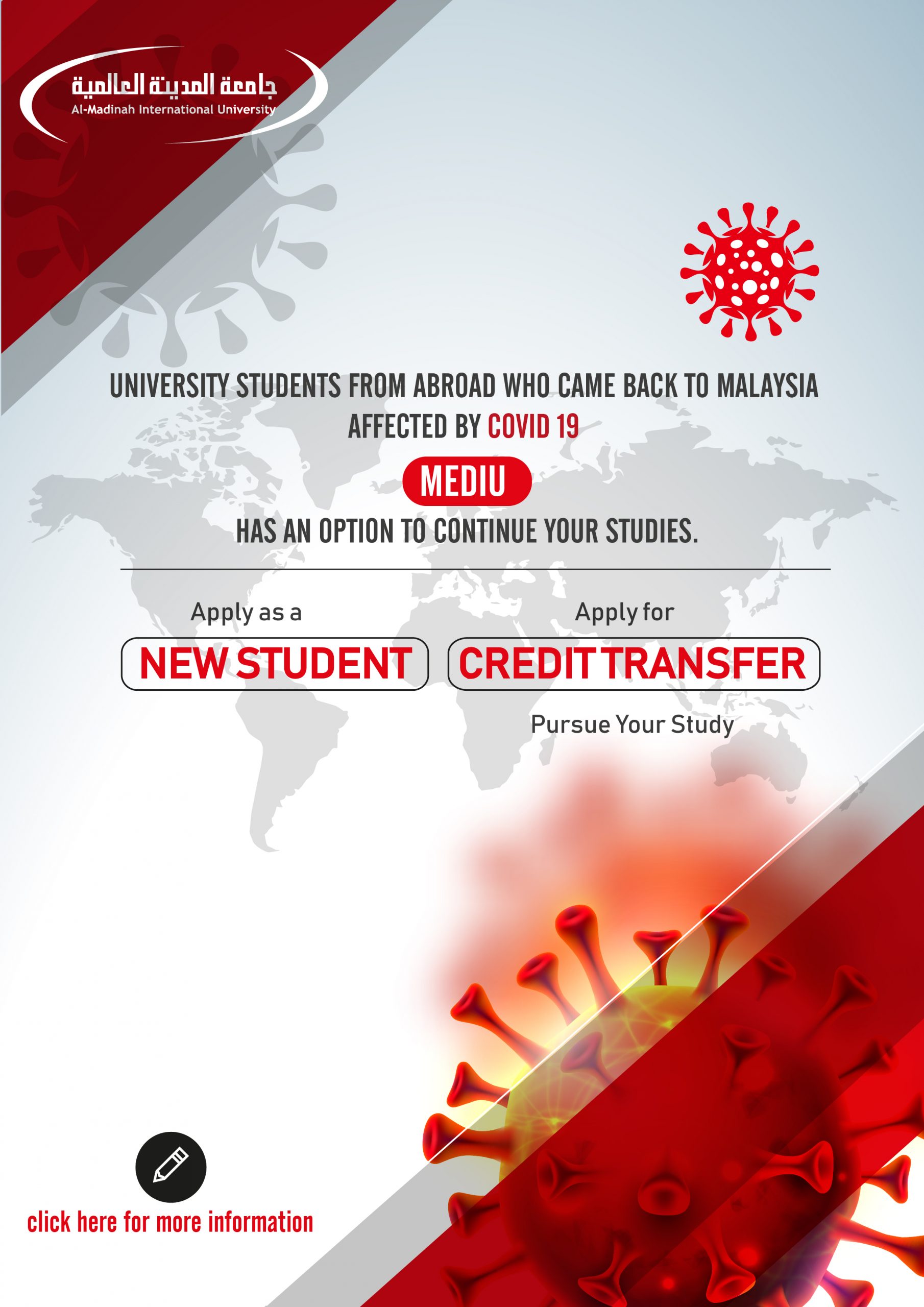 University students from abroad who came back to Malaysia affected due to the pandemic COVID-19, has an option to continue your studies at Al-Madinah International University (MEDIU).