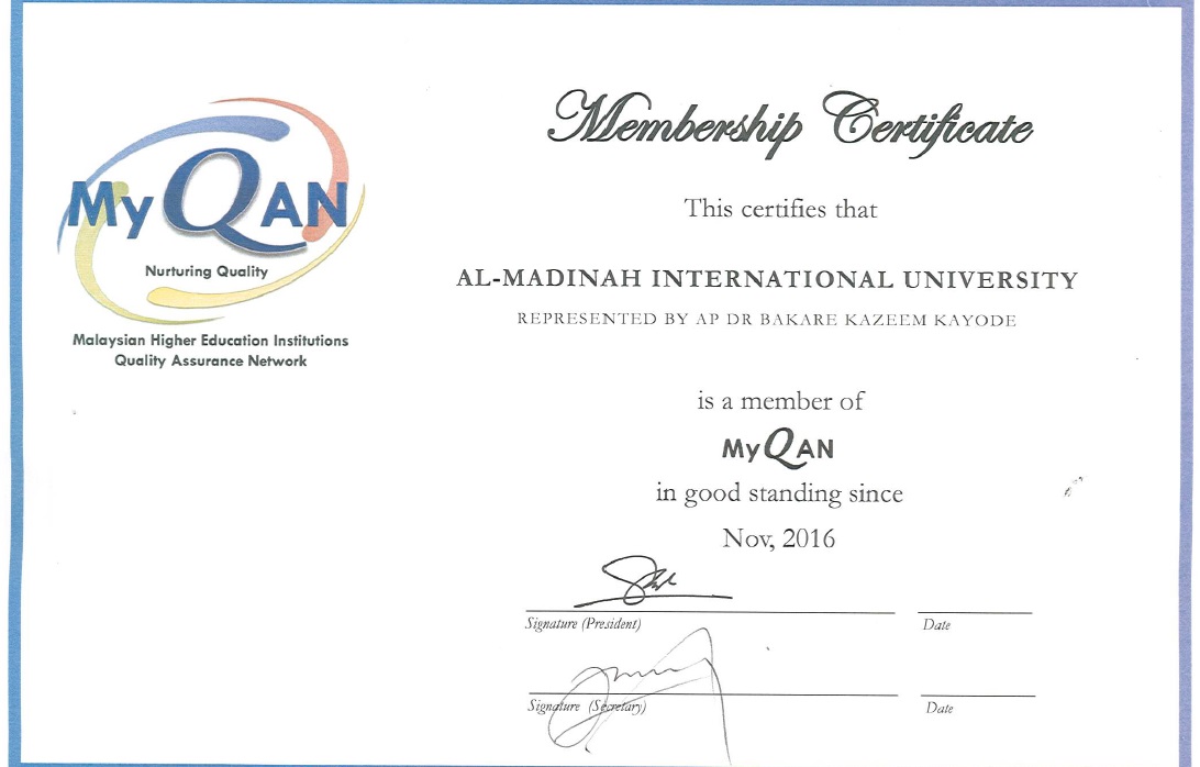 Universiti Antarabangsa Al-Madinah (MEDIU) baru-baru ini telah diakui sebagai ahli Malaysian Higher Education Institutions Quality Assurance Network (MyQAN) pada 14 November 2016, ke arah mencapai matlamat dan visi universiti di dalam mempertingkatkan kualiti pendidikan.