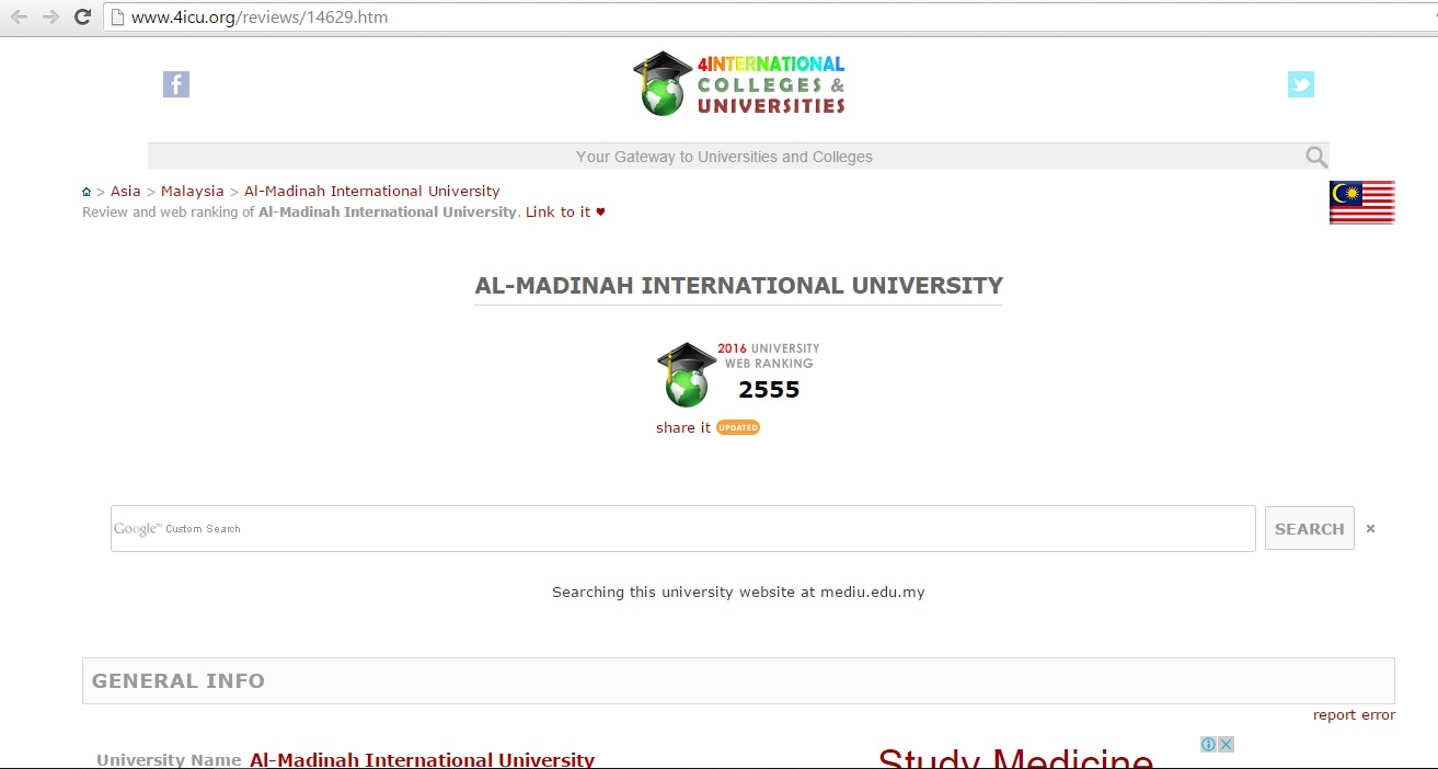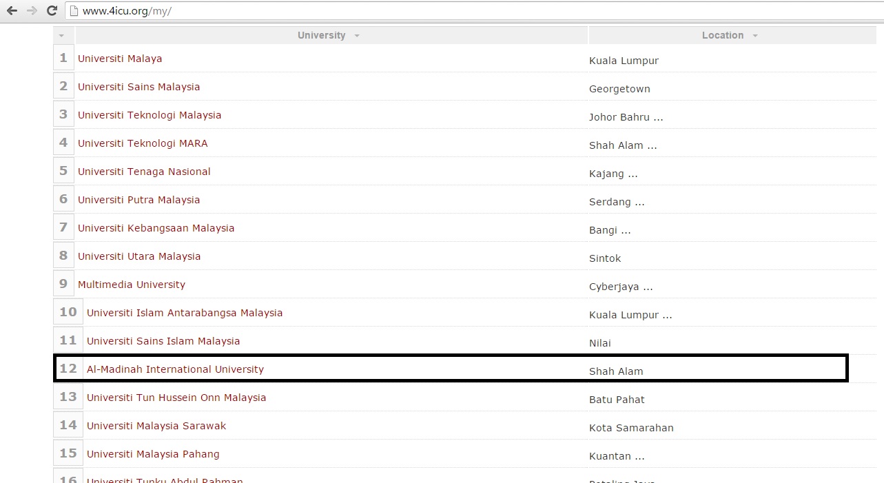 Al-Madinah International University (MEDIU) has got through the classification results of according to the Australian Classification of Universities and International Institutes (4ICUs) for the first half of 2016; with the results of 3rd place in the category of private Malaysian universities, 12th in the Malaysian universities in general and place 2,555th place for worldwide universities.