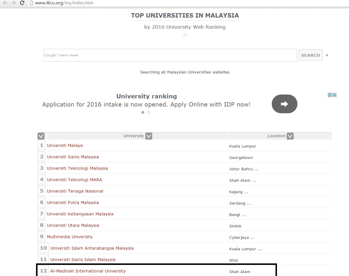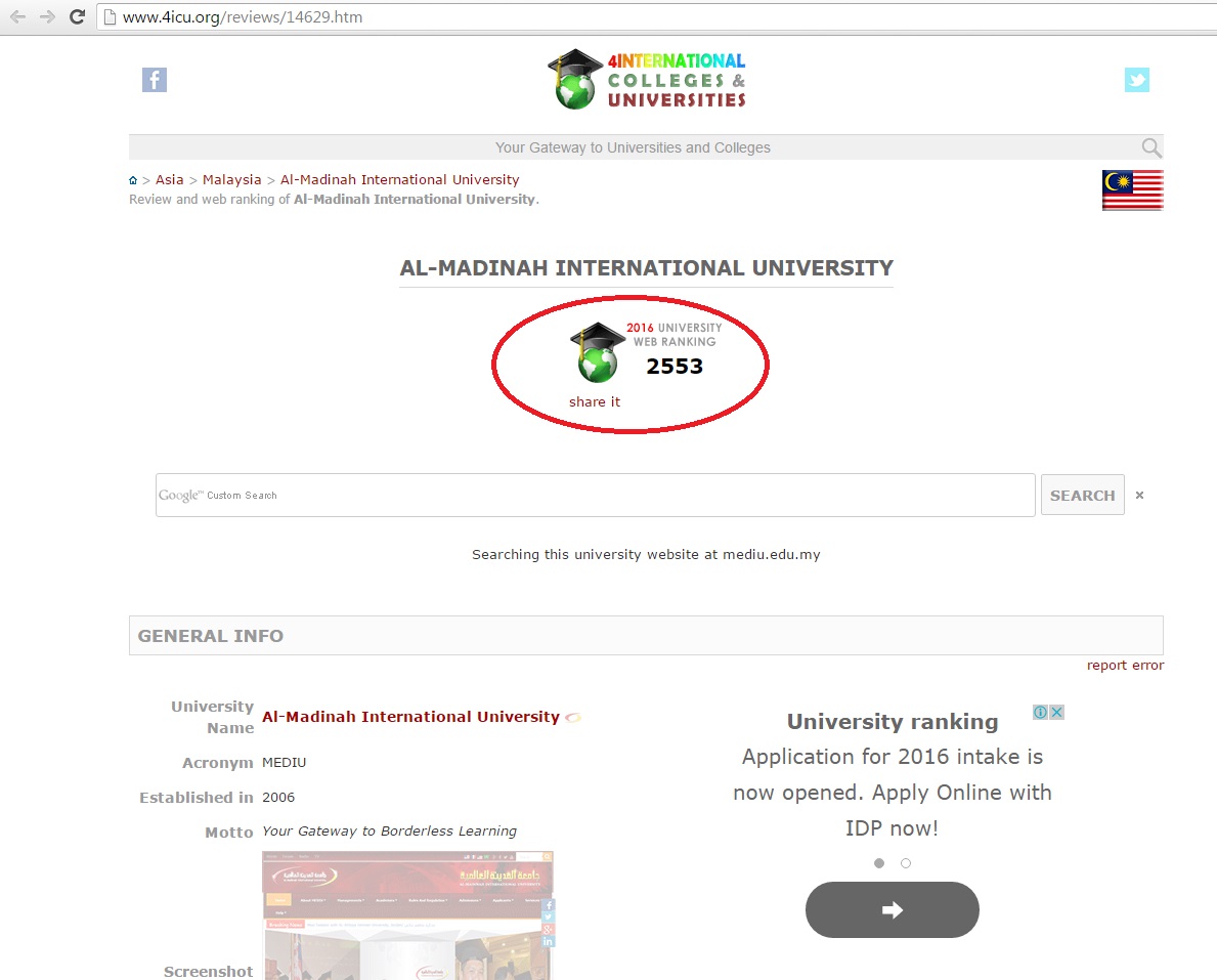 Al-Madinah International University (MEDIU) has got through the classification results of according to the Australian Classification of Universities and International Institutes (4ICUs) for April 2016; with the results of 6th place among universities in Selangor, 2nd place for district of Shah Alam. MEDIU ranked 12th in the Malaysian universities in general and place 2,553th place for worldwide universities.