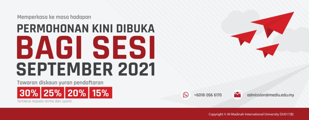 Universiti Antarabangsa Al-Madinah (MEDIU) telah merangka pembayaran yuran pengajian untuk pengambilan pelajar baru di peringkat Ijazah Sarjana Muda (Bachelor), Ijazah Sarjana (Master), dan Ijazah Kedoktoran (PhD) bagi sesi kemasukan September 2021, seperti di bawah: