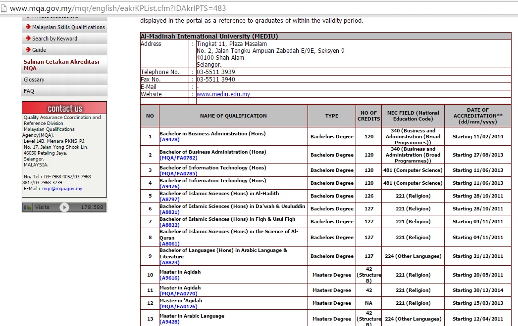بحمد لله وتوفيقه، فقد حصلت جامعة المدينة العالمية على خطاب موافقة هيئة الاعتماد الماليزية (MQA) للاعتماد النهائي لبرنامج بكالوريوس في الحديث وعلومه (MQA/FA0767) وبرنامج بكالوريوس في الدعوة وأصول الدين (MQA/FA0766) وبرنامج بكالوريوس في القرآن وعلومه (MQA/FA0768) وذلك عبر نظام التعليم المباشر. وبذلك يصبح العدد الإجمالي لبرامج جامعة المدينة العالمية الحاصلة على الاعتماد النهائي من مكتب تسجيل هيئة الاعتماد الماليزية (MQR)، 48 برنامجاً فيما بلغ العدد الإجمالي لبرامج الجامعة الحاصلة على الاعتماد المؤقت 45 برنامجاً من إجمالي 93 برنامجاً دراسياً.
