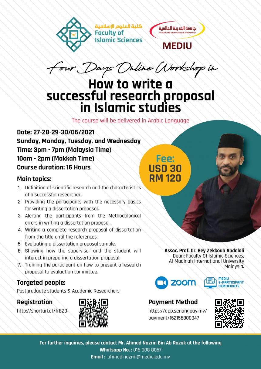 MEDIU Centre of Excellence of Al-Madinah International University (MEDIU) is pleased to bring you an online workshop ‘How To Write A Successful Research Proposal In Islamic Studies’ which will cover from title selection to references in your research proposal.