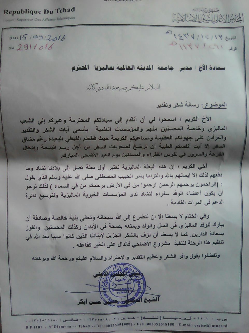 The Supreme Council for Islamic Affairs in the Republic of Chad, Sheikh Dr. Hussein Hassan acknowledged his appreciation to CEO, Prof.Dr.Mohammad Khalifa Al-Tamimi and the university’s for having the worship program in Chad. he states that the program is very meaningful the people and community of the Republic of Chad and expressed his gratitude to the Malaysian people for their generosity and making the program a success.