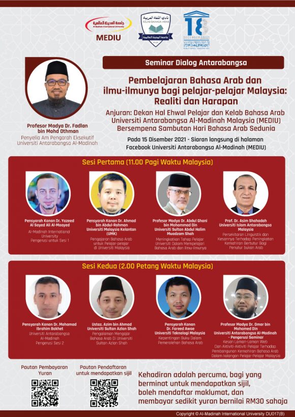 Sesi dialog ini diadakan sempena sambutan Hari Bahasa Arab Antarabangsa. Kami mengumpulkan pakar dan ahli fakulti untuk membentangkan pengalaman dan kepakaran mereka dalam mengajar bahasa Arab kepada pelajar Malaysia. Program dianjurkan oleh Kelab Dekan Hal Ehwal Pelajar dan Bahasa Arab di Universiti Antarabangsa Al-Madinah (MEDIU).