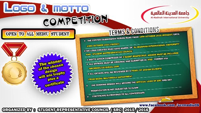 Al-Madinah International University (MEDIU) recently organized ‘Student Representative Council Logo & Motto Design Competition’ on 19 to 25 October 2015. The competition was organized by the Department of Student Affairs for the active MEDIU students in collaboration with the Student Representative Council in context to motivate the students and giving them the opportunity to express their creativity invention.