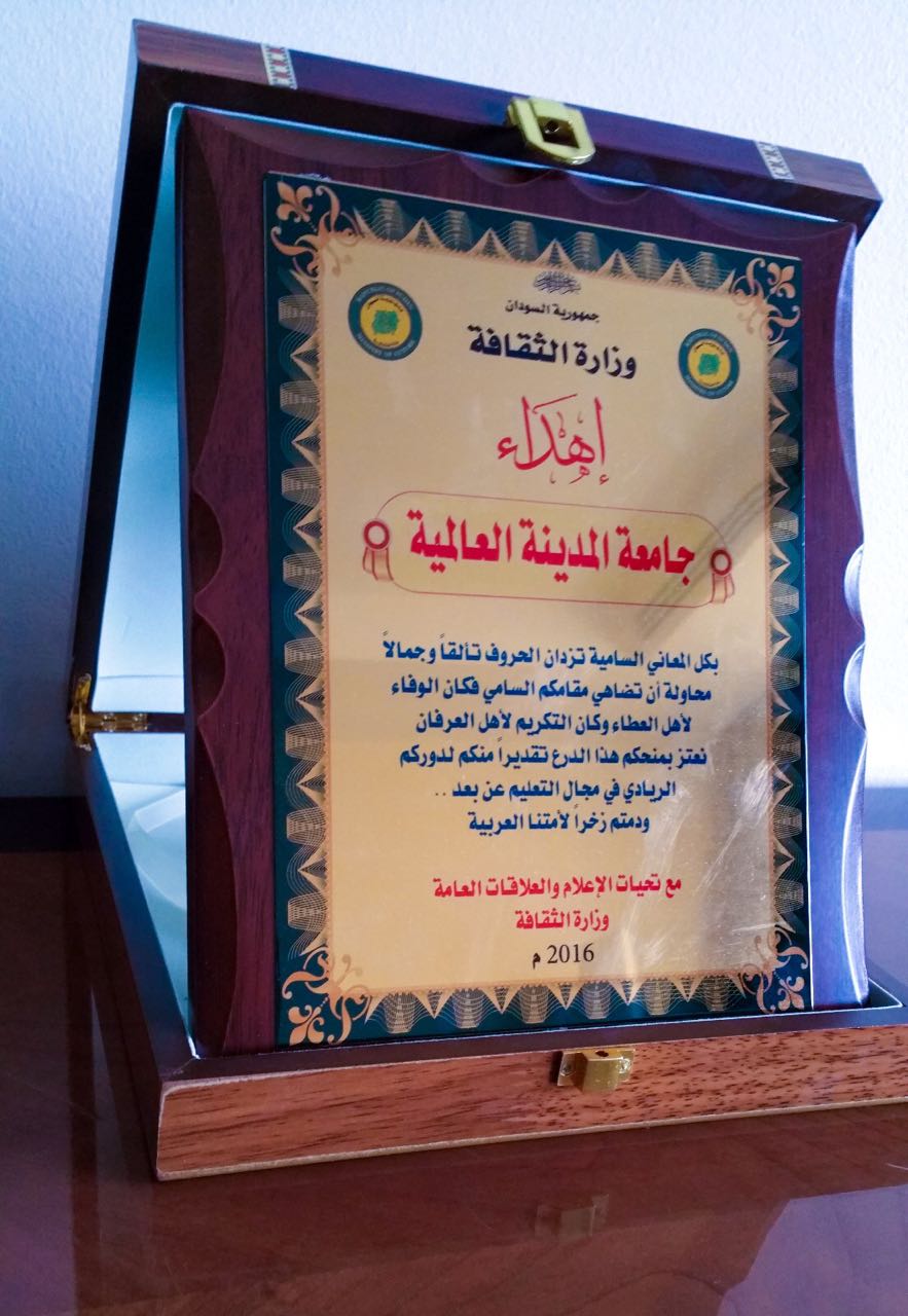 In recognition of the pioneering role in the field of distance education, a tribute to Al-Madinah International University (MEDIU) has been granted by the Ministry of Culture at a Sudanese youth training ceremony which was held on Saturday, 3 September 2016 in Khartoum, Sudan. The event was represented by the Sudan’s Minister of Culture and Sudan’s government representatives.