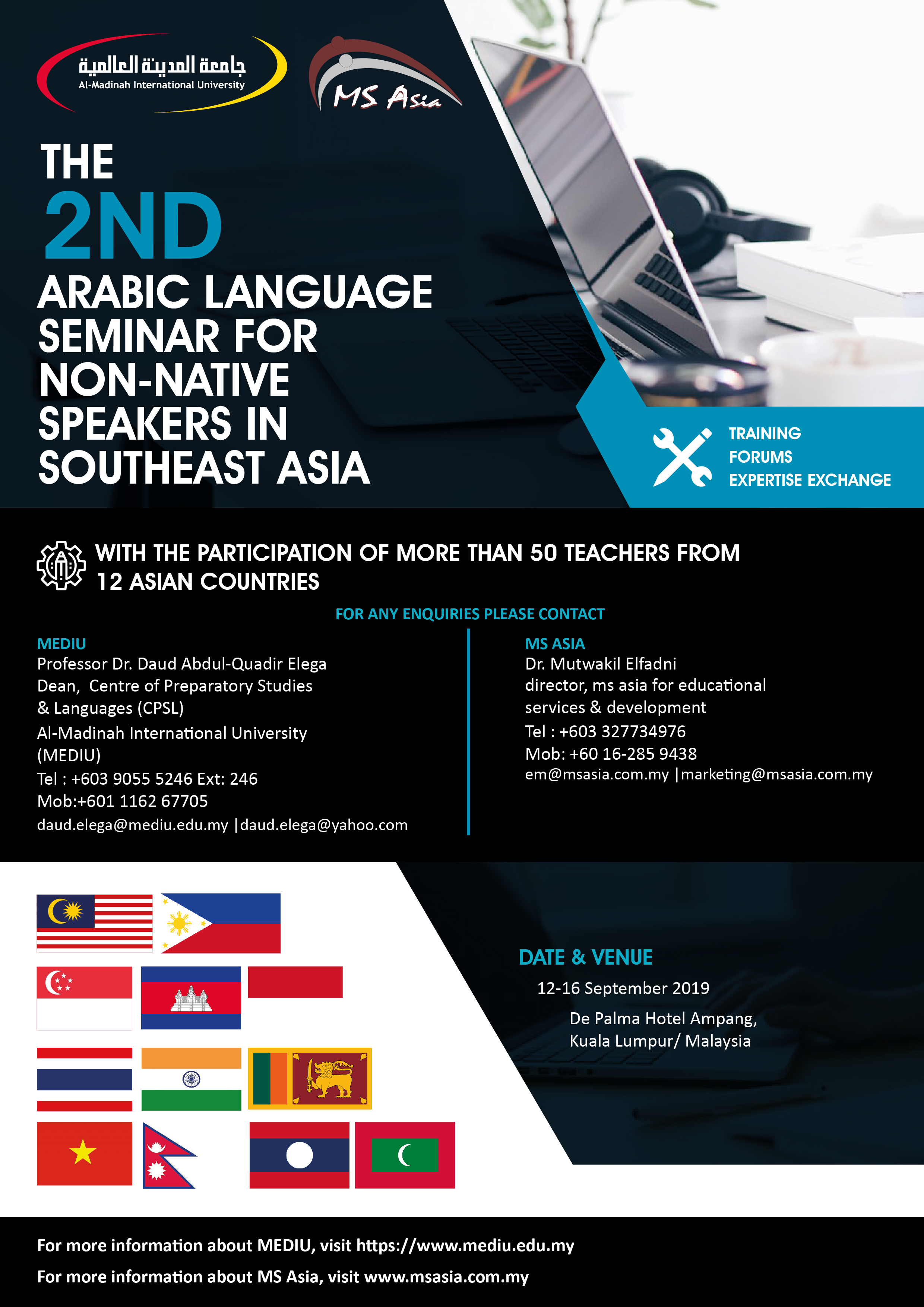 In the line of Al-Madinah International University’s objectives to have agreement of partnerships with related parties in order to achieve collaboration and integration in various areas, the Center of Preparatory Studies and Languages (CPSL) is pleased to announce the inauguration of the second Arabic Language Seminar for Non-Native Speakers in the South-East of Asia, which organized by MS Asia for Educational Services and Human Development in collaboration with and partnership of Al-Madinah International University. This seminar targets the teachers of Arabic Language for its non-native speakers in Malaysia, Indonesia, Singapore, Brunei, Philippine, Cambodia, Thailand, Vietnam, Nepal, Sri Lanka, India, Maldives and China.